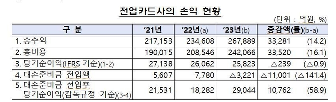 카드 사용액 증가로 할부수수료가 7천596억원, 가맹점수수료가 5천968억원, 이자수익이 2천521억원 늘었지만, 대손비용이 1조1천505억원, 이자비용이 1조1천231억원 더 많이 늘어난 데 따른 것이다. 다만, 한도성 여신 관련 규정 개정 영향으로 대손준비금 적립 후 당기순이익은 2조9천44억원으로 전년보다 58.9% 급증했다.