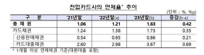 지난해 카드 대금, 할부금, 리볼빙, 카드론, 신용대출 등의 1개월 이상 연체율을 뜻하는 카드사의 연체율은 1.63%로 전년 말(1.21%)보다 0.42%포인트(p) 상승해 2014년(1.69%) 이후 9년 만에 최고치를 기록했다.