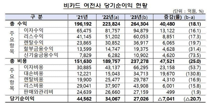 지난해 카드사를 제외한 할부금융사, 리스사, 신기술금융사 등 163개 여신전문금융회사의 당기순이익은 2조7천26억원으로 전년(3조4천67억원)에 비해 7천41억원(20.7%) 감소했다.