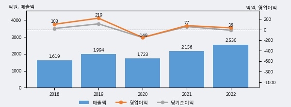 최근 실적을 살펴보면 2022년 매출액이 최근 5년 중 가장 높은 실적을 기록했음을 알 수 있다. 이전 최고 실적이었던 2021년 보다도 17.4%(374억 6천만원) 늘어난 것으로 나타났다.