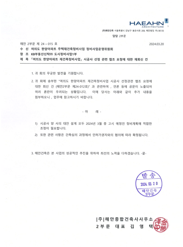 지난 5일 여의도 한양 재건축 설계사인 ‘해안건축’이 사업시행자인 ‘KB부동산신탁’에 ‘시공자 선정 관련 협조 요청’에 대한 공문이 언론에 노출되면서 논란이 불거졌다.