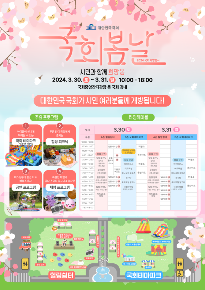 국회사무처(사무총장 백재현)는 오는 30일 토요일부터 31일 일요일까지 이틀간 시민과 함께 희망 봄 '국회봄날' 이라는 슬로건 아래 '2024 국회개방행사'를 개최한다고 밝혔다.