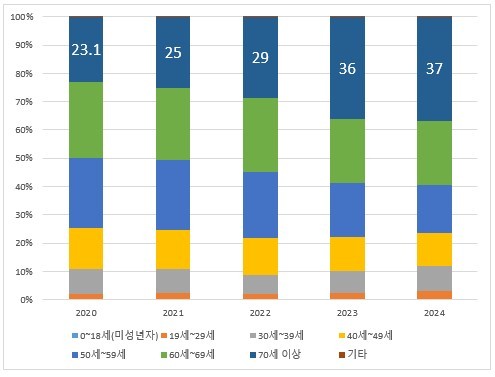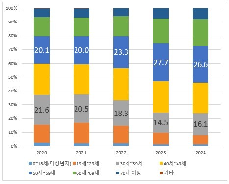아울러 수증인 역시 연령대가 높아지고 있다. 2024년 50세~59세가 26.6%로 집합건물 수증인 중 가장 높은 비율을 기록했다. 2020년 20.1%대비 6.5%p 증가했다. 이는 60세~69세 수증인도 비슷한 추세다. 2020년 13.7%에서 2024년 19.3%로 4년만에 5.6%p 증가했다. 직계존비속인 증여인의 고령화 추세에 따라 자산을 증여 받는 시점도 점차 늦어지는 추세다. 40세~49세 수증인은 2024년 22%로 2020년 22.6%보다 0.6%p차이로 감소했으나 큰 차이는 아니다.