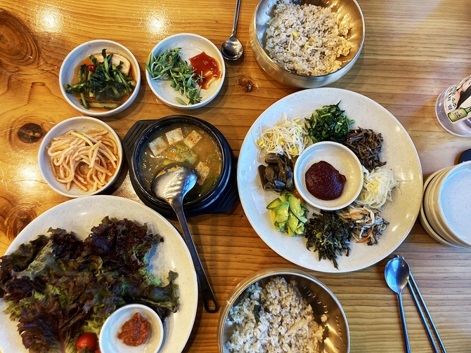 보리밥과 함께 불맛 나는 매콤한 주꾸미볶음도 주문했다. 주꾸미볶음은 구수한 보리밥과 곁들이면 아주 잘 어울린다. 비빔밥 재료로 나오는 다양한 나물, 된장찌개, 그리고 밑반찬이 조화롭게 어우러져 이 식당이 어떻게 짧은 시간 내에 지역 맛집으로 인정받게 되었는지 이해할 수 있을 것 같았다.