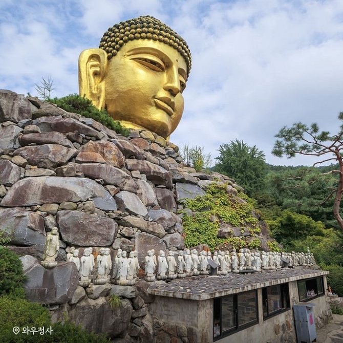 와우정사는 1970년대에 세워진, 해월삼장법사라는 실향민에 의해 창건된 호국불교의 근본 도량이다. 이곳은 단순히 불교 신자들만의 공간이 아니라 역사와 예술을 사랑하는 모든 이들에게 개방된 문화 공간으로 자리매김하고 있다. 경내에는 8미터에 달하는 대형 불두상이 자리 잡고 있으며, 12미터에 이르는 통 향나무로 만들어진 와불(臥佛, 누워 있는 부처님상)이 인상적인 볼거리를 제공한다. 특히 세계 각국에서 들여온 다양한 불상들이 봉안되어 있고, 돌로 만든 입석 십이간지 상도 볼만하여 이곳을 찾는 이들에게 문화의 다양성과 불교 예술의 진수를 보여준다. 불교뿐만 아니라 다양한 문화와 예술에 관심 있는 이들에게 추천할 만한 명소이다.