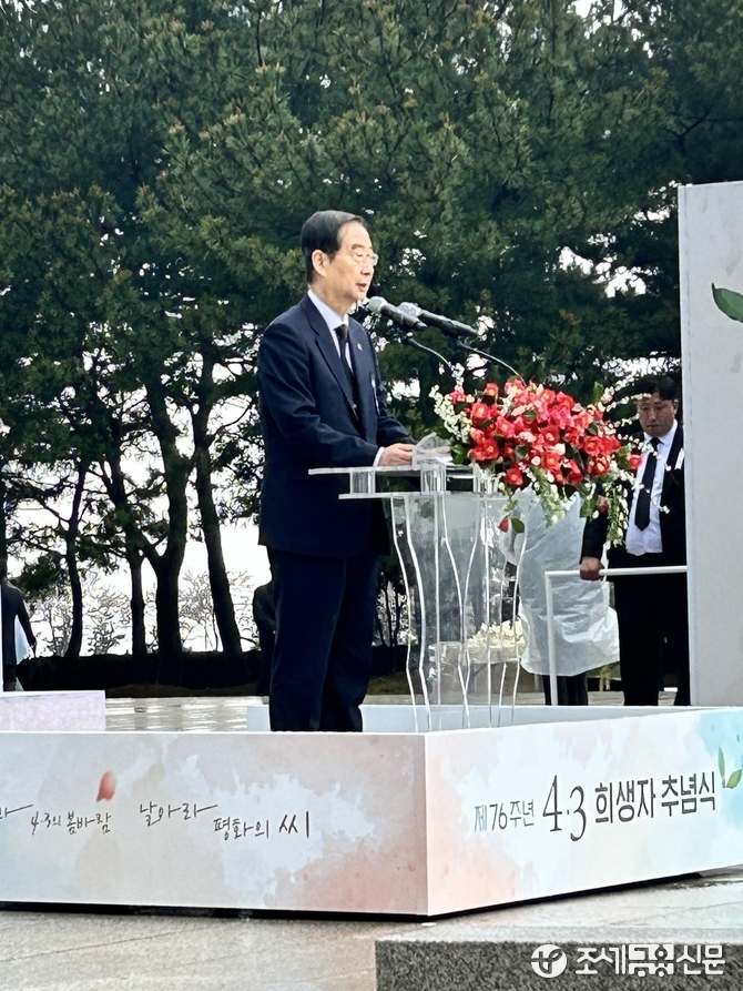 한덕수 총리는 추념사에서 “4.3사건 희생자의 넋을 기리고 유가족의 아픔을 위로하는 것은 국가의 기본적인 책무”라며 “정부는 4.3사건의 상처를 보듬고 치유해 화합과 통합의 미래로 나아갈 수 있도록 최선을 다하고 있다”고 말했다.