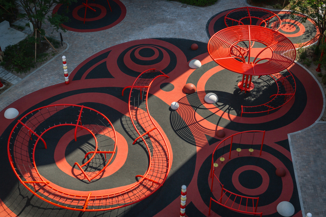 대우건설은 기존 복합놀이 기구 중심의 놀이터에서 탈피해 원형 패턴 위에 3D펜으로 그려낸 듯한 자유로운 형태의 놀이기구를 도입했다. 아티스틱 플레이그라운드는 입체적이고 현대적인 디자인 언어로 하나의 대지예술과 같은 공간이 되어 어른들과 아이들이 함께 즐기고 소통하는 장소로 자리 잡았다.