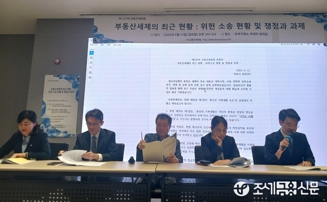 사단법인 금융조세포럼(회장 김도형)이 '부동산세제의 최근현황:위헌 소송 현황 및 쟁점과 과제'를 주제로 이날 주최한 포럼은 이전오 전 성균관대 교수(법학전문대학원)의 사회로 진행됐다. 법무법인 세종의 윤진규 변호사, 법무법인 태평양 주성준 변호사, 한국세무사회 연구이사인 김연정 세무사가 토론자로 참여해 열띤 토론을 이어갔다.