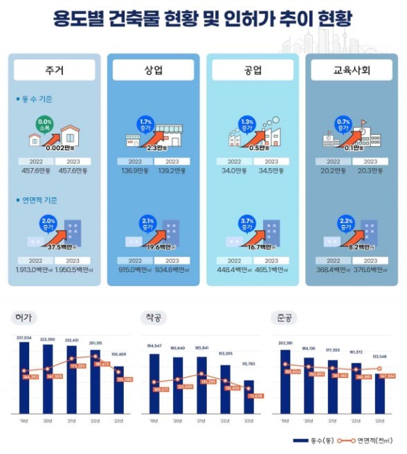 2023년도 전국 건축물의 동수는 작년보다 3만6744동(전년 대비 0.5%)이 증가한 739만1084동이며, 연면적은 작년보다 9632만㎡(2.3%)이 증가한 42억2766만㎡으로 집계됐다.