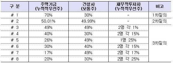 추가적으로 주택기금이 50% 미만 출자하는 뉴스테이의 주요 의사결정 방식 및 6가지 지분구조를 구성해, 해당 리츠가 민간건설사의 재무제표 연결대상인지 여부에 대해 지난 7월10일 회계기준원에 3차 질의를 했다.