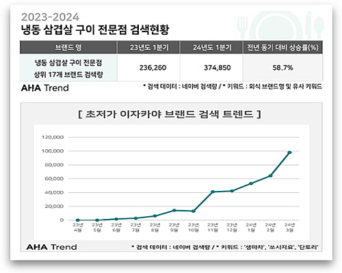 ‘냉삼’ 또는 ‘대패’가 포함된 육류구이 전문점들의 검색량을 살펴본 결과 상위 17개 브랜드의 검색량은 2023년 1분기 23만 6천 건에서 2024년 1분기 37만 4천 건으로 증가했다. 상승률로는 전년 동기간 대비 58.7% 증가한 것이라는 설명이다.