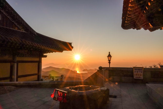 ‘온 산을 비단으로 두르다’는 뜻의 금산(錦山)은 남해의 진산이자 소원을 이뤄주는 명산으로 익히 알려져 있으며, 정상 부근 절벽 사이에는 천년고찰 보리암이 있다. 보리암은 낙산사 홍련암, 석모도 보문사와 더불어 불교 신도들에게는 3대 기도처로 유명한 관음 도량이다. 7백여 미터 금산 정상 아래에 위치한 보리암 절 앞으로 펼쳐지는 한려해상의 풍경이 아름답다. 특히 다도해 넘어 섬 사이로 떠오르는 일출과 금산 정상 봉수대에서 반대편으로 떨어지는 낙조가 압권이다.