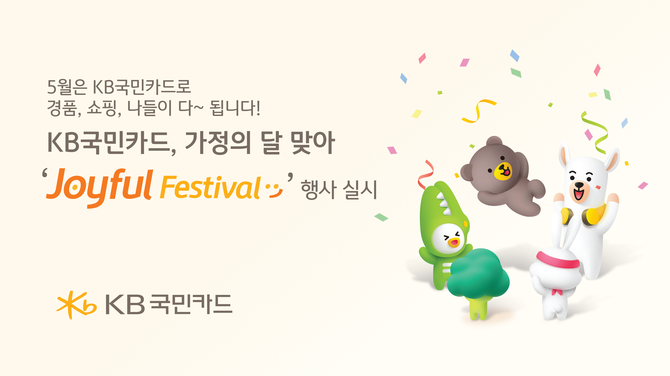 (조세금융신문=김영기 기자) KB국민카드(사장 이창권)가 5월 가정의 달을 맞아 ‘Joyful Festival’을 주제로 행운의 경품 추첨, 가족 선물 쇼핑 혜택, 기분좋은 나들이 할인 등 다양한 행사의 자리로 초대했다.