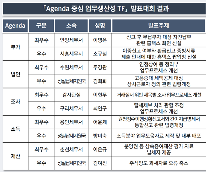 최우수상은 부가분야 안양세무서 이영은, 법인분야 수원세무서 주경관, 조사분야 감사관실 이현무, 소득분야 용인세무서 어윤제, 재산분야 춘천세무서 이은규 조사관이 각각 수상했다.