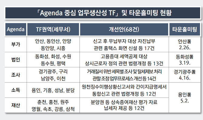 (조세금융신문=고승주 기자) 중부지방국세청(청장 오호선)은 2일 용인세무서에서 아젠다 중심 업무생산성 TF 발표대회를 개최하고, 법령개정·업무프로세스・전산시스템에 대한 개선안 68건을 발굴했다고 밝혔다.