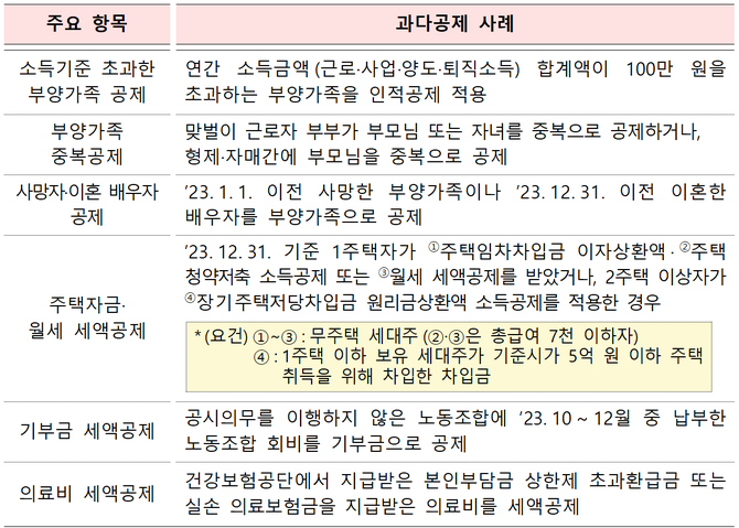 연간 소득금액(근로‧사업‧양도‧퇴직소득) 합계액이 100만원을 초과하는 부양가족을 인적공제에 넣은 경우가 대표적인 사례다.