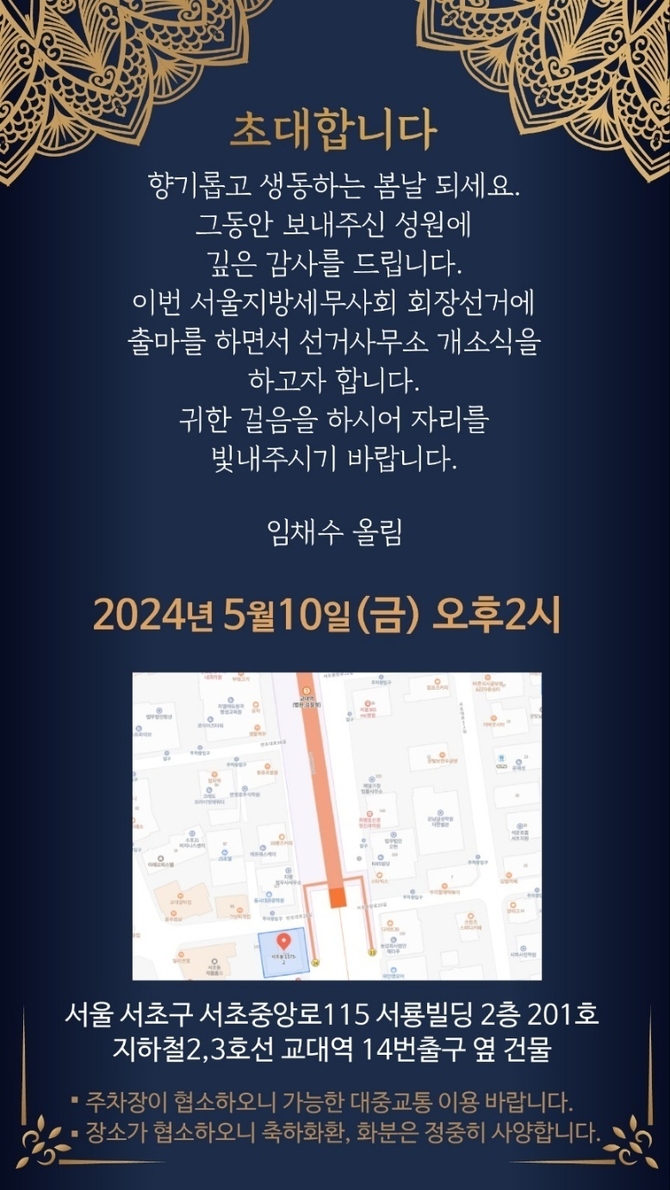 (조세금융신문=안종명 기자) 임채수 현 서울지방세무사회장이 오는 6월 10일 치러질 제17대 서울지방세무사회장 출마를 위한 선거사무소 개소식을 갖는다.