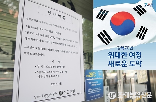 (조세금융신문=전한성 기자) 정부가 광복 70주년을 기념하여 14일을 임시 공휴일로 지정한 가운데 서울 여의도 신한은행 정문 앞에 관련 안내 문구가 붙어있다.