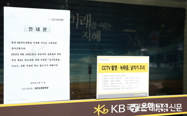 (조세금융신문=전한성 기자) 정부가 광복 70주년을 기념하여 14일을 임시 공휴일로 지정한 가운데 서울 여의도 KB국민은행 정문 앞에 관련 안내 문구가 붙어있다.