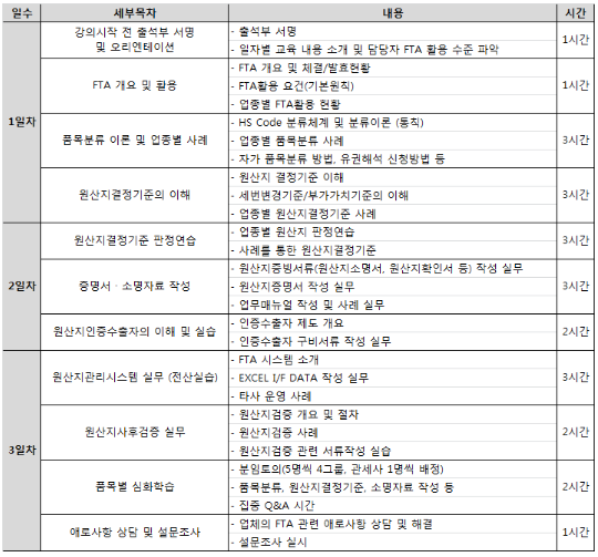 - 2일차: ①업종별 원산지결정기준 판정 실습 ②FTA 소명자료 작성 실습 ③원산지인증수출자의 이해 및 실습