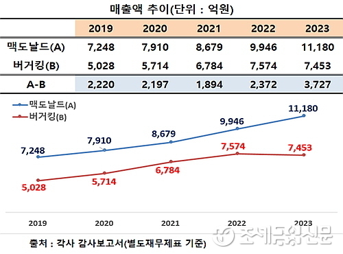 이로써 양사의 매출 격차는 지난 2019년 2220억, 2020년 2197억, 2021년 1894억, 2022년 2372억 원에서 지난해는 3727억 원으로 크게 벌어져 특단의 전기가 없을 경우 버거킹이 맥도날드의 외형을 따라잡는 것이 쉽지는 않을 것이란 전망이 대세를 이루고 있다.