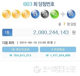 (조세금융신문=김태효 기자) 15일 실시된 제 663회 나눔로또 추첨결과 1등 당첨번호는 3, 5, 8, 19, 38, 42이다. 2등 보너스번호는 20번이다.