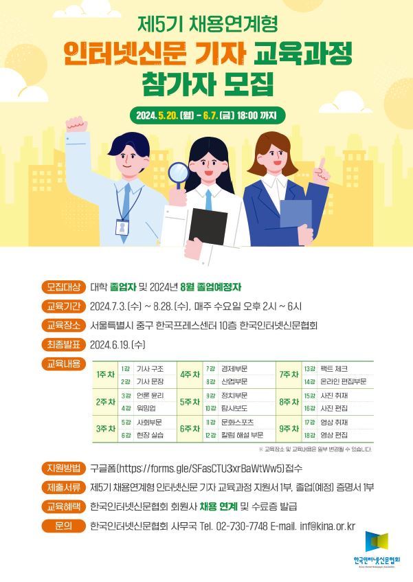채용연계 교육 합격자는 6월 19일(수) 개별 통보 예정이다. 자세한 내용은 한국인터넷신문협회 홈페이지를 통해서도 확인할 수 있다.