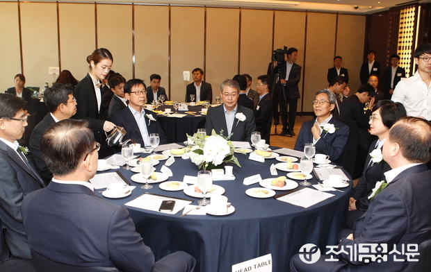 (조세금융신문=전한성 기자) '무역보험공사-6대 시중은행 해외SOC 펀드 금융지원 업무협약식'이 17일 오후 서울 중구 소공로 웨스틴 조선호텔에서 열린 가운데 임종룡(오른쪽 네번째) 금융위원장이 시중은행장들과 나란히 앉아 있다.