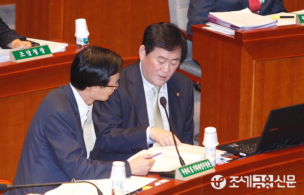 (조세금융신문=전한성 기자) 제336회국회(임시회) 제2차 예산결산특별위원회 전체회의가 18일 오전 서울 여의도 국회 예결위 회의실에서 열린 가운데 최경환(오른쪽) 경제부총리 겸 기획재정부 장관이 방문규 제2차관과 자료를 보며 대화 나누고 있다.