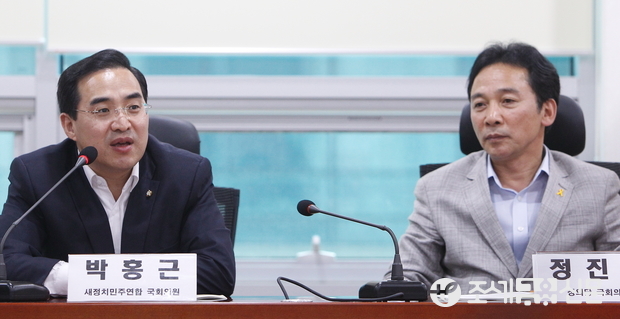 (조세금융신문=전한성 기자) 사학연금제도개선을 위한 공동대책위원회가 주관하는 '정부·여당의 사학연금 개편논의, 무엇이 문제인가? - 가입자 입장에서 바라보는 사학연금의 문제점과 제도개선의 방향'이 18일 오후 서울 여의도 국회 의원회관에서 열린 가운데 새정치민주연합 박홍근(왼쪽) 의원이 축사를 하고 있다.