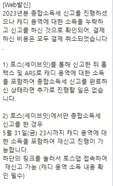 (조세금융신문=이지한 기자) 토스(세이브잇/택사스소프트)는 종합소득세 신고 마감을 앞둔 31일, 토스를 이용해 종합소득세를 신고한 인적용역 대상자에 대해 “2023년분 종합소득세 신고 캐디 용역에 대한 소득누락이 확인됐다”며 “결제비용은 모두 결제 취소되었으며 31일 23시까지 재신고할 것”이라고 긴급안내를 시작했다.