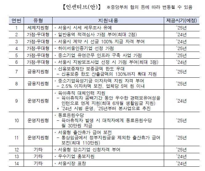 특히 서울시 세무조사 유예를 2025년에 제공하고, 중소기업육성기금 이자차액 지원 자격도 부여해 업체당 5억원이내로 2.5% 이자차액을 보전해준다. 뿐만 아니라 서울시 지방보조사업 선정 시 가점을 부여한다.