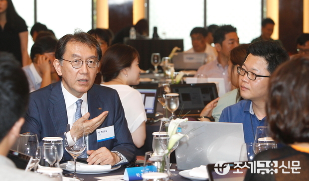 (조세금융신문=전한성 기자) '한국시티은행 기자간담회'가 19일 오전 서울 중구 소공로 웨스틴 조선호텔에서 열린 가운데 박진회(왼쪽) 행장이 기자들과 대화 나누고 있다.