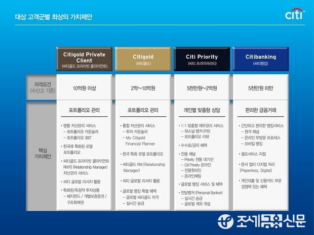 이를 위해 씨티은행은 씨티은행은 이를 위해 수신고 기준으로 고객군을 △씨티뱅킹(5000만원 미만) △씨티 프라이어리티(5000만~2억원) △씨티 골드(2억~10억원) △씨티골드 프라이빗 클라이언트(10억원 이상) 등 4단계로 세분화 해 각군별로 특화된 자산관리 서비스를 제공한다는 계획이다.