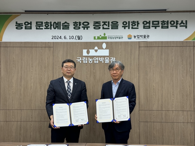 주요 협약 내용은 ▲양 기관 보유 자료를 활용한 상호 전시 협력 ▲농업·농촌의 역사와 문화 가치 확산을 위한 콘텐츠 개발 ▲공동 학술행사 및 교육·체험 기획 협력 ▲전국 농업계 박물관·전시관 협력망 사업 수행 등이다.