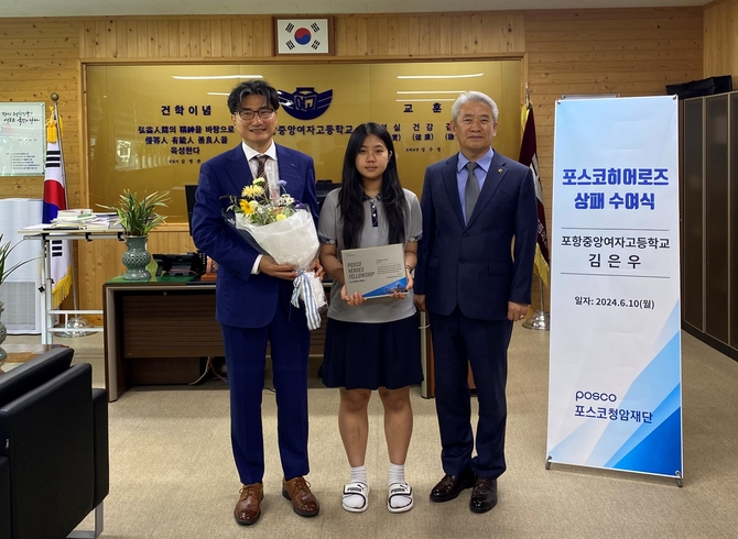 (조세금융신문=김필주 기자) 포스코청암재단은 다리에서 투신하려던 남성을 붙잡아 생명을 구한 포항중앙여자고등학교 3학년 김은우 양을 포스코히어로즈로 선정해 지난 10일 상패·장학금을 전달했다고 11일 밝혔다.