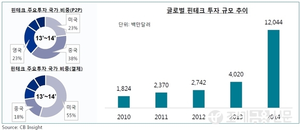 (조세금융신문=김사선 기자) 최근 5년간 글로벌 핀테크 산업에 대한 투자 증가세가 계속되고 있는 가운데, 2014년 글로벌 핀테크 투자규모는 120억 달러로 전년 대비 3배 가량 증가했다. 이 중, 중국이 최근 핀테크 산업에서 가장 빠르게 발전하는 국가인 것으로 나타났다.