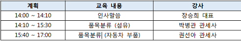 품목분류는 수출입 통관과 FTA 등 무역전반에 기본이 되는 중요한 사안으로 기본원칙의 숙지와 다양한 사례를 많이 접해야 한다. 따라서 이번 8 월 교육에는 실무에 있어 가장 애로 사항이 많은 섬유와 자동차 부품에 대한 기본적인 품목분류 개요부터 다양한 품목분류 사례를 소개할 예정이다.