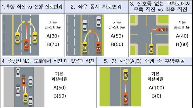 사고 유형별 기본 과실비율을 보면 도로를 선행해 진행하다가 차로를 변경하는 B차량과 동일방향에서 후행 직진하는 A차량이 충돌한 사고에서는 A차량의 과실비율이 30, B차량의 과실비율이 70으로 정해진다.
