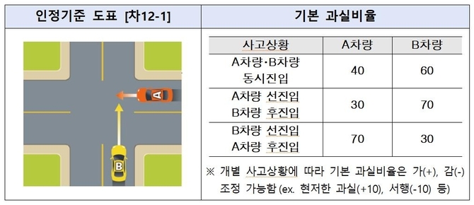 다만 A차량이 교차로에 먼저 진입한 경우에는 A차량 과실비율이 30으로 떨어지고, 반대로 A차량이 나중에 진입한 경우에는 A차량 과실비율이 70으로 올라간다.