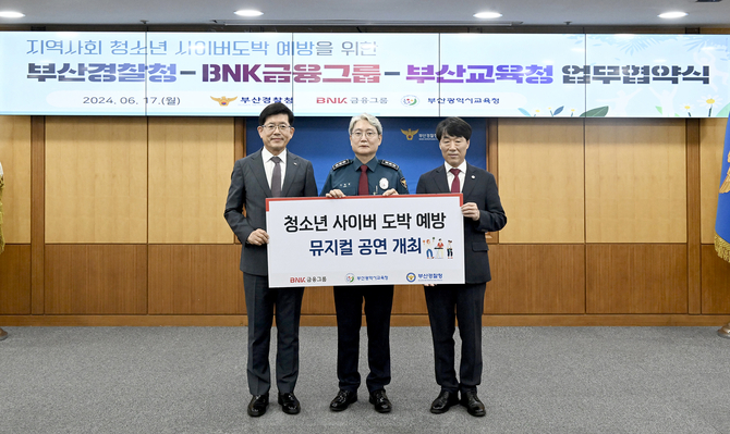 (조세금융신문=구재회 기자) BNK금융그룹(회장 빈대인)은 17일 부산시교육청(교육감 하윤수), 부산경찰청(청장 우철문)과 함께 ‘청소년 사이버 도박 예방 뮤지컬 및 교육 운영’을 위한 업무협약을 체결했다고 밝혔다.