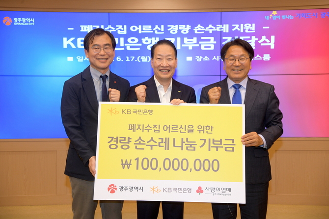 서영익 국민은행 기관영업그룹 부행장 등은 17일 광주시청 비즈니스룸에서 열린 기부금 전달식에서 광주사회복지공동모금회를 통해 손수레 구입 비용 1억원을 기탁했다.