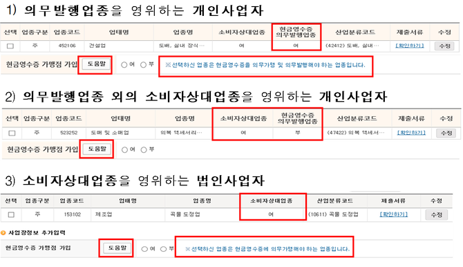 현금영수증 의무가입 사업자는 홈택스에서 사업자등록을 신청하는 경우, 의무가입대상 여부를 안내받고 현금영수증 가맹점 가입도 동시에 신청할 수 있다.