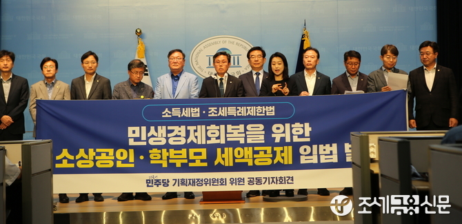 더불어민주당 기획재정위원회 위원들은 24일 국회 소통관에서 고물가, 고금리 내수침체의 삼중고 상황이 지속되면서 600만 소상공인들의 삶이 토대에서부터 흔들리고 있다며 '소상공인·학부모 세액공제법'을 공동 발의했다고 밝혔다.