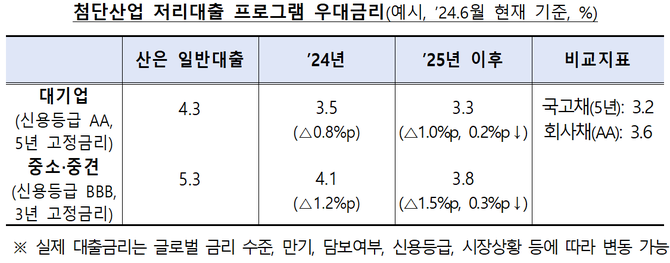 대기업은 산업은행의 일반 대출 대비 0.8~1.0%p, 중소·중견기업은 1.2~1.5%p 낮은 우대 금리를 적용받으며, 기존 대출을 돌려막기 위한 대출 명목(대환 대출)은 지원대상이 아니다.