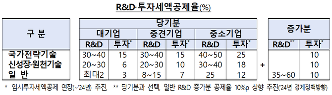 연구개발 투자는 대‧중견 30~40%, 중소기업 40~50%의 세액공제를 받는다.