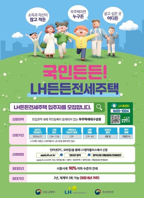 ‘든든전세주택’은 오는 7월 24일부터 26일까지 3일간 신청받아 29일 서류심사 대상자를 발표한 뒤, 서류심사를 거쳐 8월말 당첨자를 발표할 예정이다.
