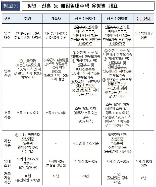 ‘신혼·신생아 매입임대주택’은 결혼 7년 이내 신혼부부, 예비신혼부부, 신생아가구 등을 대상으로 공급하는 주택이다. 소득·자산기준 등에 따라 신혼·신생아Ⅰ,Ⅱ 유형으로 구분된다.