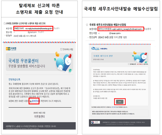 국세청은 ‘수정신고’,‘탈세제보’,‘세무조사’ 관련 제목은 열람하기 전 삭제하거나 스팸메일 신고할 것을 당부하고, @hometax1.co.kr, ~@hom_tax.com, ~@nnts.com 등 모르는 이메일은 열지 말되 @nts.go.kr, @hometax.go.kr 등 올바른 도메인으로 메일이 왔다고 해도 함부로 확인하지 말 것을 강조했다.