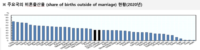 김 교수가 제시한 주요국의 비혼출산율에 따르면 우리나라 비혼출산츌이 2020년 기준 2.5%, 합계출산율이 0.84명인데 반해 프랑스의 경우 비혼출산율이 62.2%로 합계출산율이 1.79명으로 나타났다.